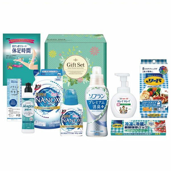 【ギフト対応】 <内祝い 洗剤 セット>ライオンの売れ筋ブランドを選りすぐった、手にしたその日から大活躍の洗剤セット 商品内容:●ライオントップスーパーナノックス420g×1・ライオントップスーパーナノックス詰替320g×1・ライオンソフランプレミアム消臭620ml×1・ライオンチャーミーマジカ速乾プラス220ml×1・ライオンキレイキレイ薬用泡ハンドソープ250ml×1・ライオンリード冷凍も冷蔵も新鮮保存バッグS3枚×1・ライオン休足時間2枚入×1・ライオンリードヘルシークッキングペーパースマートタイプ36枚×1・メラミンスポンジスリム×1 ※ハンドソープ=医薬部外品●箱サイズ(約)22×16.5×28.5cm●箱重量(約)2.4kg●梱包状態:化粧箱入 ※のし包装(ラッピング)はひとつずつ無料で致します。