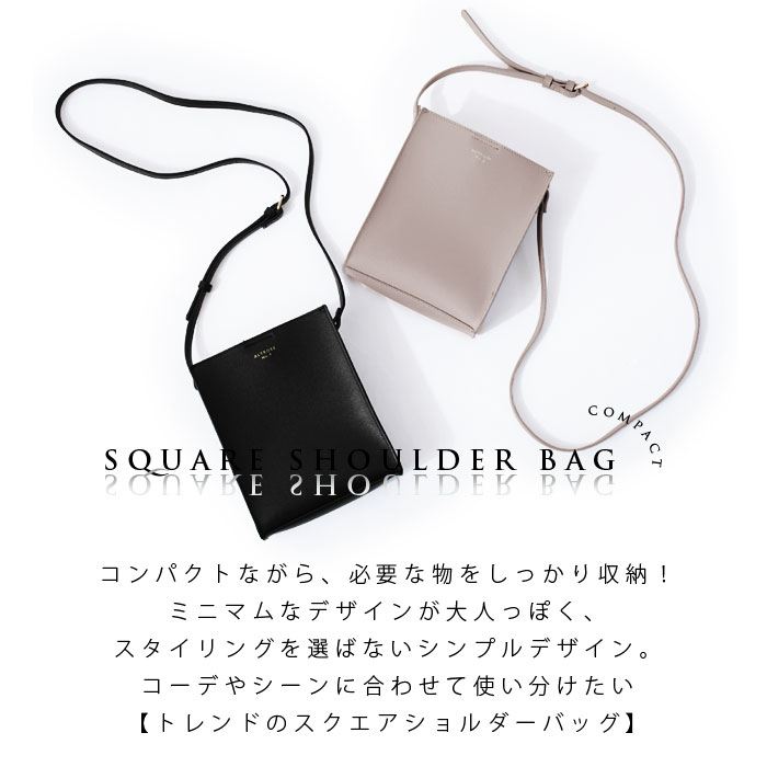 商品について コンパクトながら、必要な物をしっかり収納できる!【トレンドの縦型スクエアショルダーバッグ mini】ミニマムなデザインが大人っぽく、スタイリングを選ばないシンプルデザイン。